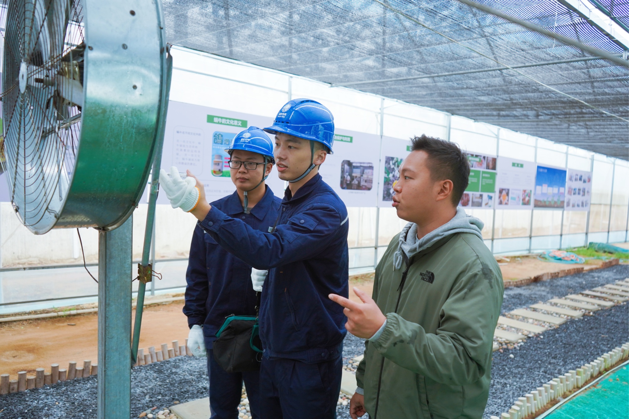 福州平潭供電公司工作人員為白玉蝸牛大棚養殖基地檢查通風設備用電(國網福州供電公司供圖)