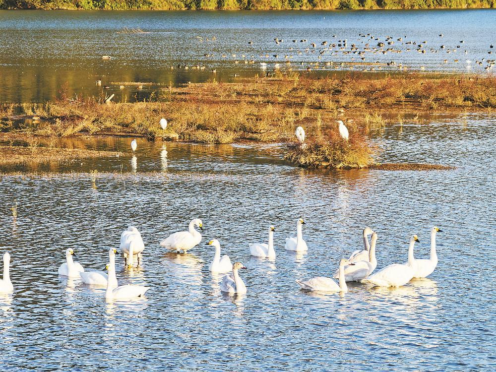 19日下午,在武夷山國家公園一號風景道建陽將口鎮路段、崇陽溪漫游道沿線,大批國家二級保護動物白天鵝飛抵。