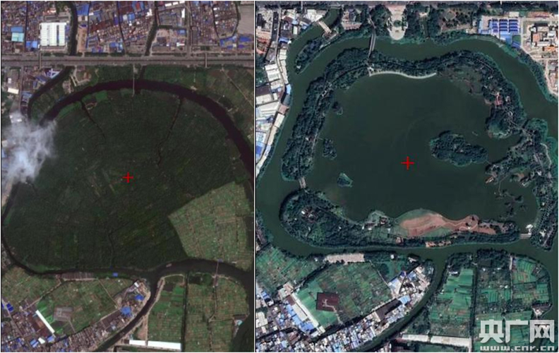 2009年(左)與2018年(右)海珠湖衛星圖對比(央廣網發 資料圖)