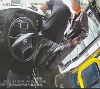 公交技工羅章瑞、王超正在想辦法取出劉先生的手機(jī) 車載監(jiān)控視頻截圖