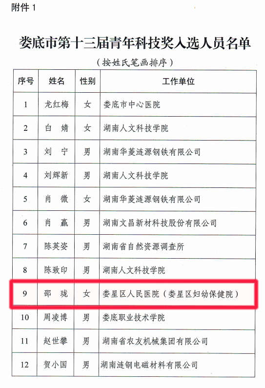 婁底市第十三屆青年科技獎入選人員名單(婁星區人民醫院 供圖)