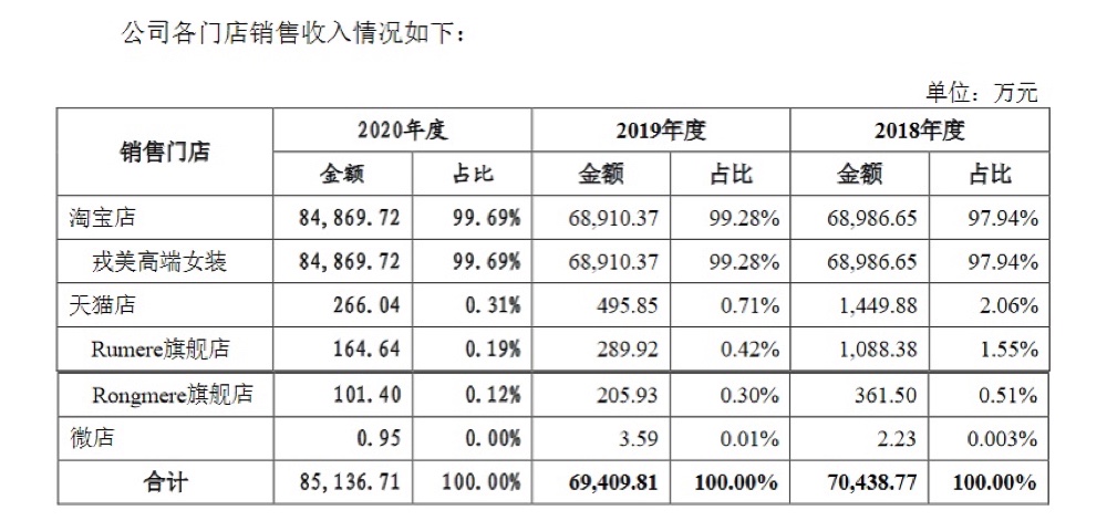 據戎美股份招股說明書,戎美股份成立于2012年3月13日,是一家線上服飾品牌零售公司,基于互聯網平臺,依托“戎美RUMERE”品牌,公司經營服裝的企劃設計、供應鏈管理和銷售業務,主要產品包括職業與休閑風格的女裝及男裝和配飾等,旗下有淘寶金冠店和天貓店等多個銷售平臺。其中,戎美股份99%以上的銷售額來自淘寶店鋪“戎美高端女裝”。