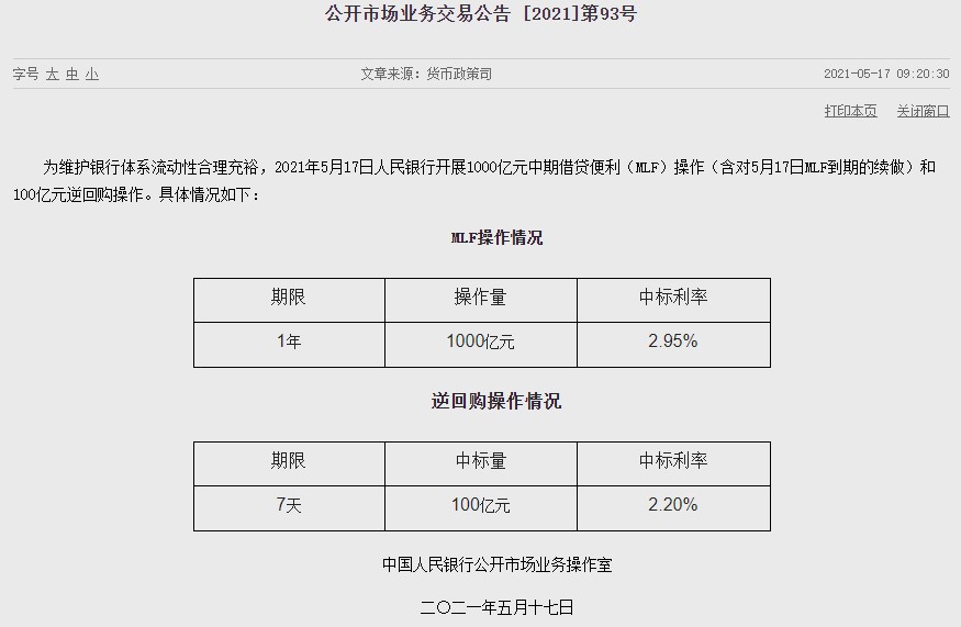 2021年5月17日,央行開展100億元逆回購操作和1000億元中期借貸便利(MLF)操作,操作利率分別為2.20%與2.95%。