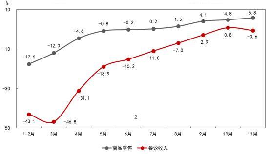 餐飲消費規模接近同期。11月份,餐飲收入同比下降0.6%,規模與上年同期基本持平。在國慶中秋雙節假日因素帶動下,10月份餐飲收入年內首次同比正增長,本月餐飲收入雖然出現小幅下降,但餐飲消費整體依然保持穩定的復蘇態勢。從累計增速看,1—11月份,餐飲收入同比下降18.6%,降幅比1—10月份收窄2.4個百分點。