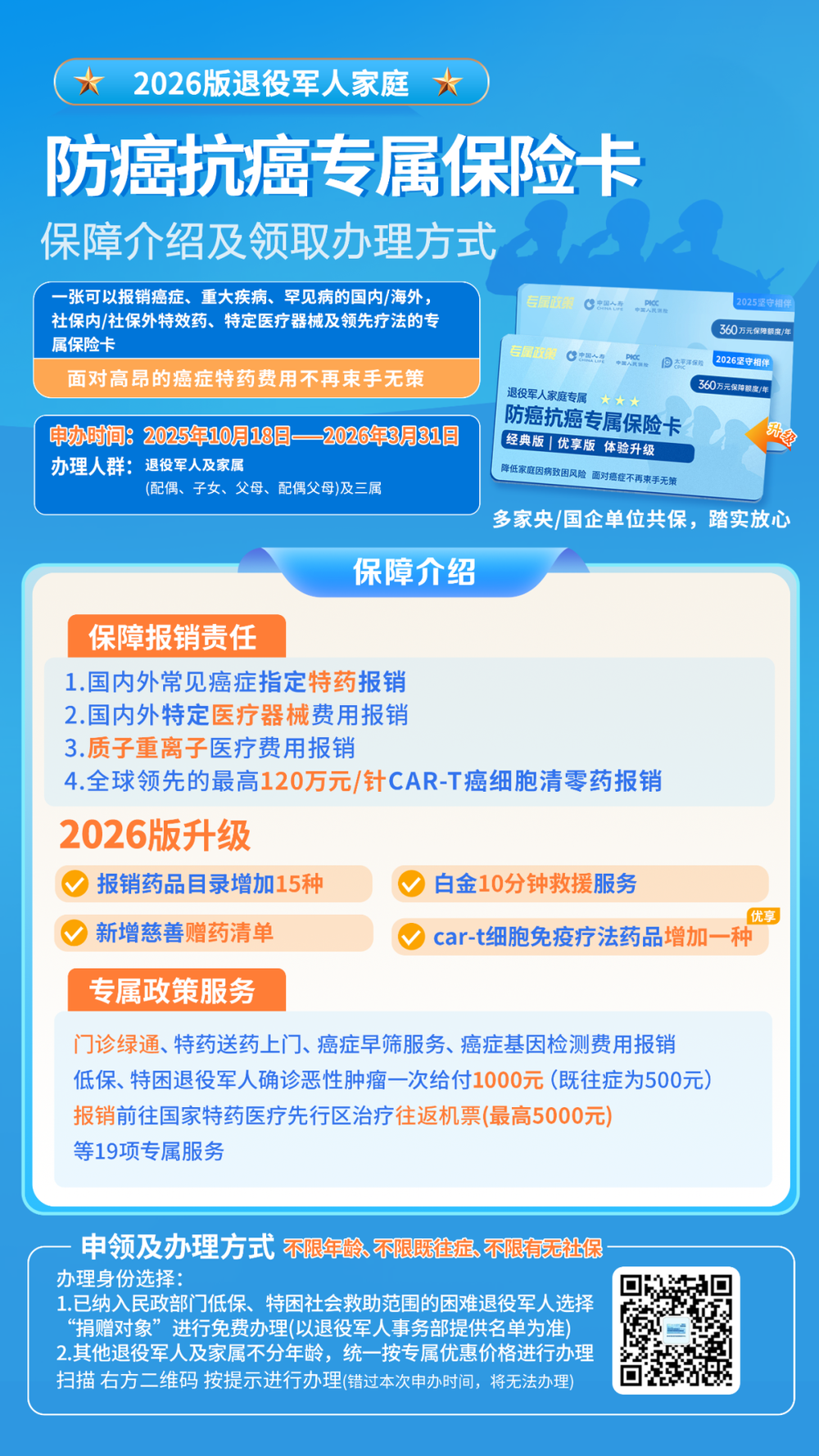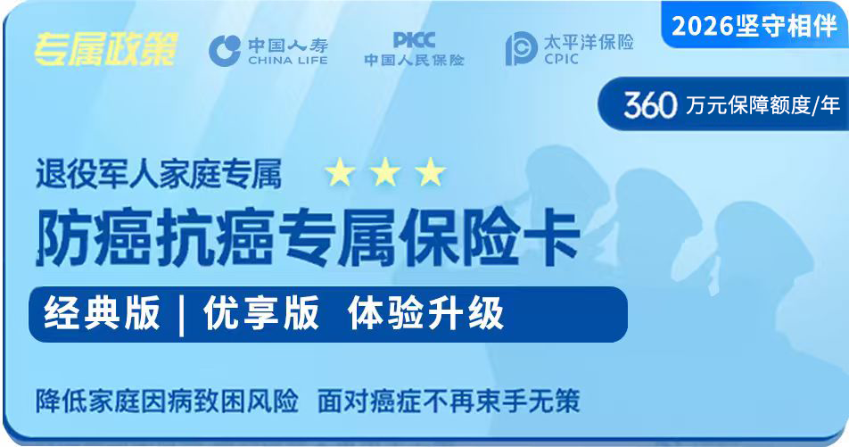 為切實(shí)解決退役軍人及家屬就醫(yī)用藥難題,進(jìn)一步提升保障效能,中國(guó)人壽協(xié)同多家央企保險(xiǎn)單位,結(jié)合上一年度項(xiàng)目實(shí)施實(shí)際情況,對(duì)退役軍人家庭“防癌抗癌專屬保險(xiǎn)卡”保障方案進(jìn)行全新升級(jí)!