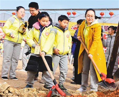 湖南長(zhǎng)沙:孩子們體驗(yàn)迎春禮,2月4日是農(nóng)歷二十四節(jié)氣之首的“立春”,湖南長(zhǎng)沙諾貝爾搖籃少年兒童農(nóng)場(chǎng)舉辦傳統(tǒng)迎春禮等活動(dòng),再現(xiàn)長(zhǎng)沙消失100多年的迎春禮場(chǎng)面。圖為孩子們?cè)诜N樹。本報(bào)記者 趙樹宴攝