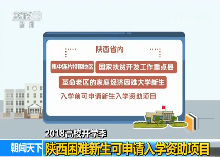 陜西省內集中連片特困地區、國家扶貧開發工作重點縣、革命老區的家庭經濟困難大學新生,入學前可申請新生入學資助項目。就讀本省院校的每人500元,就讀省外院校的每人1000元。同時,在陜西省地方高校就讀的建檔立卡家庭的大學本專科學生,每人每年還可領取6000元的助學金生活補助。