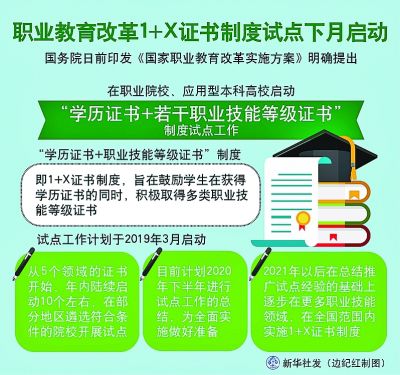 “職教20條”提出,從2019年開始,在職業院校、應用型本科高校啟動“學歷證書+若干職業技能等級證書”制度試點(以下稱1+X證書制度試點)工作。試點工作要進一步發揮好學歷證書作用,夯實學生可持續發展基礎,鼓勵職業院校學生在獲得學歷證書的同時,積極取得多類職業技能等級證書,提高就業創業本領,緩解結構性就業矛盾。