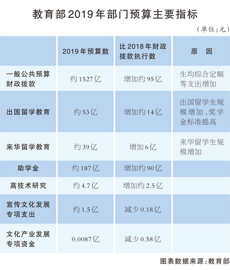 關于資金來源,教育部2019年部門預算顯示,2019年一般公共預算財政撥款約為1527億元,比上年執行數增加約95億元。其主要原因為生均綜合定額、出國留學經費以及學生資助工作專項等支出增加。