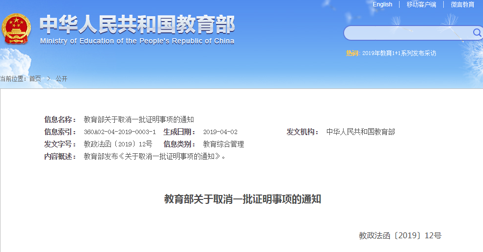 據教育部網站獲悉,為減證便民,辦好人民滿意的教育,教育部公布取消一批證明事項,即部門規章設定的10項證明事項、部門規范性文件設定的12項證明事項,以及無明文規定但在部分地區或學校實施的7項證明事項。