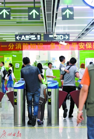 家長帶著兒童進地鐵閘口。