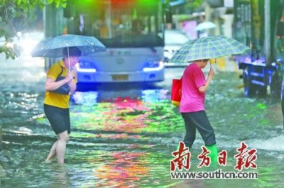 26日下午5時30分,廣州越秀區東湖西路永勝上沙,暴雨突襲,街坊們小心翼翼地蹚水而過。 南方日報記者 李細華 攝影報道
