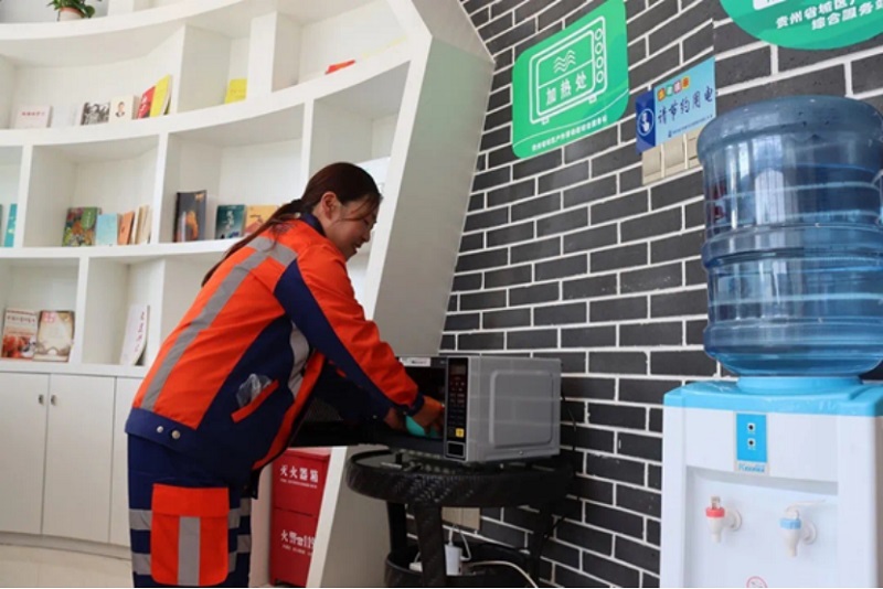 貴州省貴陽市花溪環衛職工休息站,方便戶外工作者歇腳納涼,場所寬敞,設施完備,室內外環境優良,有專人維護。圖為一位環衛工人在服務站內加熱午飯(央廣網發 貴州省總工會權益保障與法律工作部供圖)