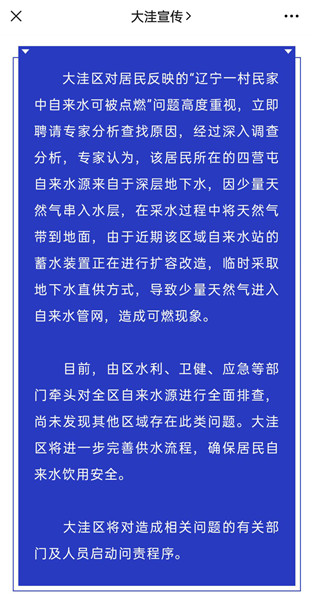 根據(jù)此前大洼區(qū)委宣傳部公布的調(diào)查結(jié)果,專家認(rèn)為,該居民所在的四營屯自來水源來自于深層地下水,因少量天然氣串入水層,在采水過程中將天然氣帶到地面。近期該區(qū)域自來水站的蓄水裝置正在擴(kuò)容改造,臨時(shí)采取地下水直供方式,導(dǎo)致少量天然氣進(jìn)入自來水管網(wǎng),造成可燃現(xiàn)象。
