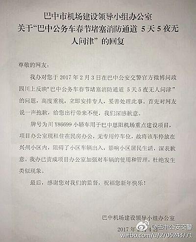 2月4日,巴中公安交警在“問政四川”平臺回復(fù)稱,巴中市機(jī)場建設(shè)領(lǐng)導(dǎo)小組辦公室對網(wǎng)友反映的“巴中公務(wù)車春節(jié)堵塞消防通道5天5夜無人問津”一事作出回應(yīng);貜(fù)稱,經(jīng)調(diào)查發(fā)現(xiàn),該車用于巴中市恩陽機(jī)場重點(diǎn)建設(shè)項(xiàng)目,由于項(xiàng)目辦公室現(xiàn)租住在民房辦公,無專用停車位,故將車輛停放在興州小區(qū)內(nèi),阻礙了小區(qū)車輛出入,影響了小區(qū)居民生活。