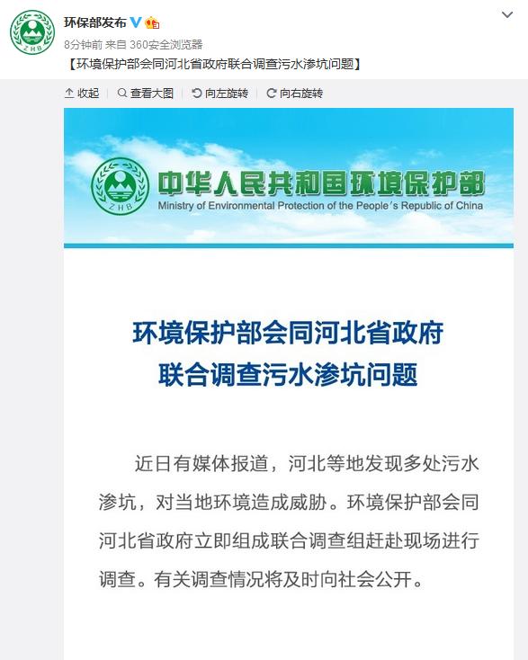 央廣網(wǎng)北京4月19日消息 據(jù)環(huán)境保護(hù)部宣傳教育司官方微博消息,近日有媒體報道,河北等地發(fā)現(xiàn)多處污水滲坑,對當(dāng)?shù)丨h(huán)境造成威脅。環(huán)保部會同河北省政府已成立聯(lián)合調(diào)查組趕赴現(xiàn)場進(jìn)行調(diào)查。