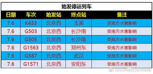 據北京西站官方微博消息,受湖南、湖北部分地區持續強降雨影響,北京西站多部列車停運。據通知顯示,停運的多為往來武漢、長沙、貴陽等受水害嚴重地區列車。網上購票未取票的旅客可以直接從網上退票。