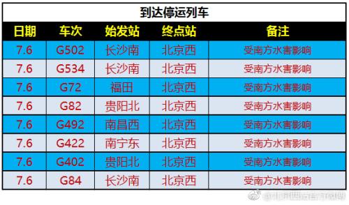 中新網7月6日電 據北京西站官方微博消息,受湖南、湖北部分地區持續強降雨影響,北京西站多部列車停運。據通知顯示,停運的多為往來武漢、長沙、貴陽等受水害嚴重地區列車。