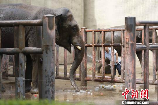 圖為飼養(yǎng)員給大象淋浴。 韓璐 攝