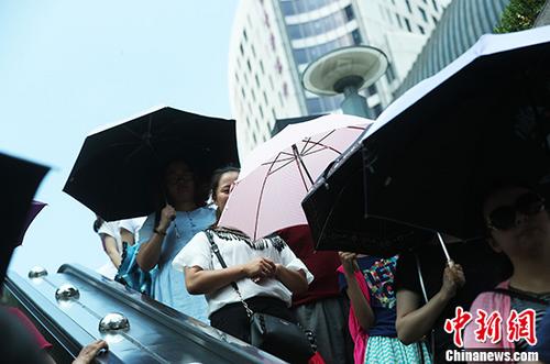 7月21日,上海街頭的行人以各種辦法遮擋炙熱的陽光。當日12時22分,上海中心氣象臺發布今夏首個高溫紅色預警,中心城區最高氣溫將達40℃。 中新社記者 湯彥俊 攝
