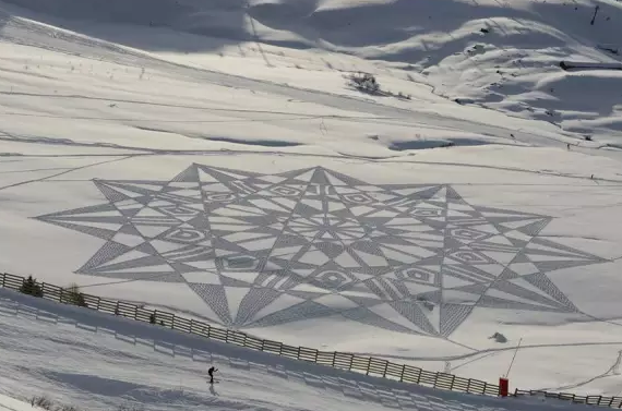 這其實是世界上第一個雪藝家Simon Beck的杰作。這些神奇的畫都是他用腳踩出來的…………