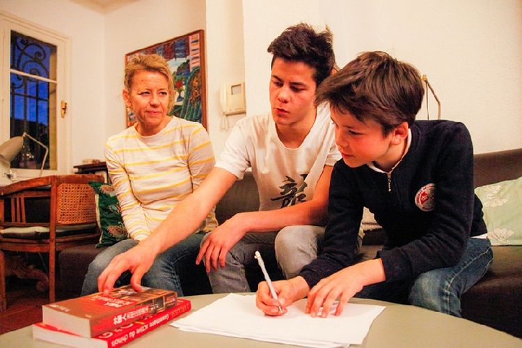 漢娜·丘吉爾和兩個兒子在家練習中文。新華社記者連振攝