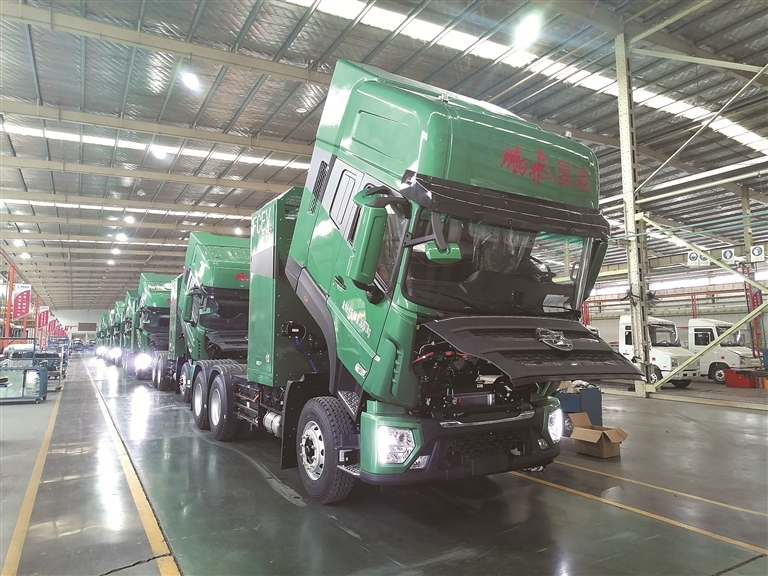 氫能重卡生產(chǎn)車(chē)間里,一批卡車(chē)即將交付使用(中共呂梁市委改革辦供圖)