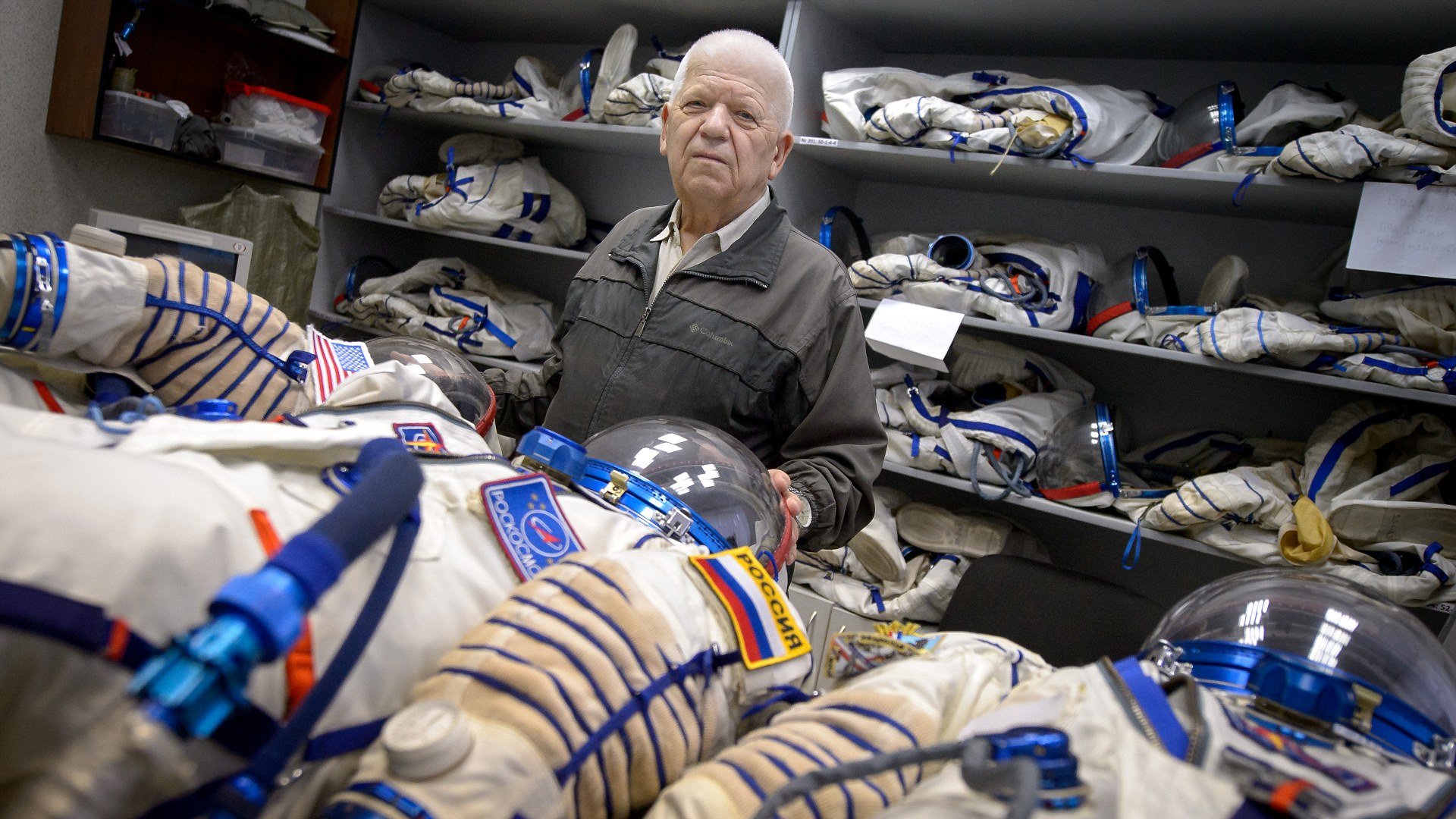圖為加加林太空服設計師伊萬 克留奇科夫與索科爾發射任務所使用的發射、著陸服合影 -