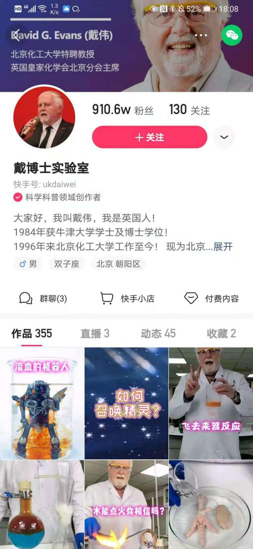 以快手科普領(lǐng)域創(chuàng)作者戴博士為例。身為牛津大學(xué)化學(xué)博士、北京化工大學(xué)教授,來華20年,致力于通過各種新奇實(shí)驗(yàn)進(jìn)行化學(xué)科普,足跡遍布中國許多邊遠(yuǎn)鄉(xiāng)村。2019年,在戴博士牽頭下,快手聯(lián)合英國皇家化學(xué)協(xié)會(huì)舉辦“化學(xué)夏令營”項(xiàng)目,讓更多人發(fā)現(xiàn)化學(xué)的神奇。目前,戴博士在快手粉絲超過910萬。