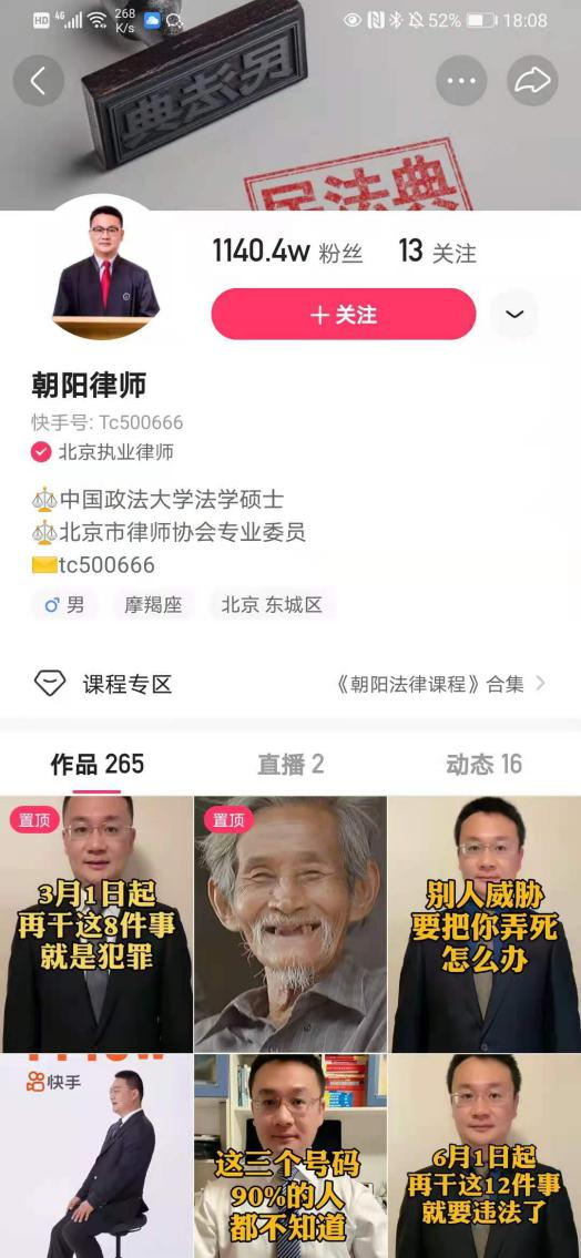 另一個(gè)快手新知達(dá)人“朝陽律師”,2016年入駐快手,第二年粉絲就沖破百萬,現(xiàn)在已經(jīng)有1140萬名粉絲,致力于進(jìn)行法律方面的科普與援助。目前,“朝陽律師”通過在快手上每周可以收到80多個(gè)法律咨詢訂單,并提供法律知識(shí)付費(fèi)課程,成為職業(yè)創(chuàng)作者經(jīng)營變現(xiàn)的教科書之一。