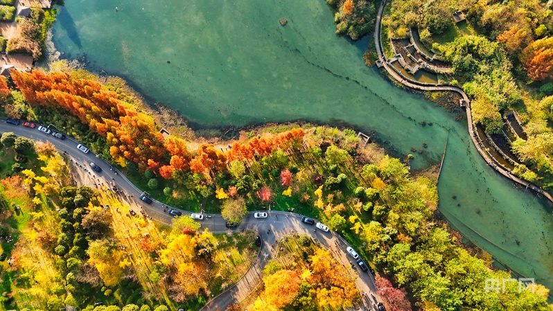 央廣網六盤水11月19日消息(記者楊贇)連日來,隨著氣溫逐漸回升,天氣持續晴好,貴州六盤水明湖國家濕地公園內呈現出絢爛的冬日景致。火紅的楓葉、金黃的銀杏、如雪的蒹葭交織在一起,構成一幅詩意盎然的斑斕畫卷。陽光灑落,湖光瀲滟,山色清朗,彼此映襯,意趣盎然,吸引了眾多游客前來觀光打卡。