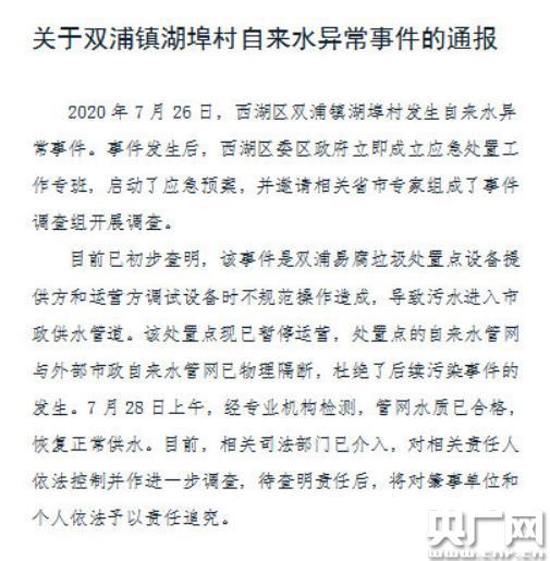 央廣網(wǎng)杭州7月30日消息(記者曹文君 范雨婷)7月30日下午,杭州西湖區(qū)通報了關(guān)于雙浦鎮(zhèn)湖埠村自來水異常事件的相關(guān)情況,全文如下:
